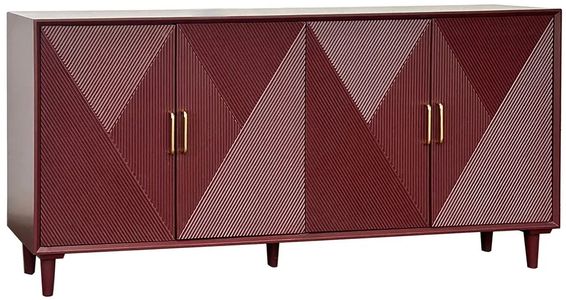 Elevate your space with this acacia wood media credenza/sideboard in a merlot painted finish. Featuring four doors with diagonal detail, antique brass pulls, removable shelves, and cord management, it blends elegance and function. Tapered legs with adjustable levelers ensure stability.Read More