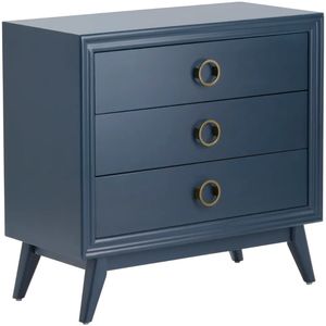 Standing confidently or tucked into a nook, this Crestview Collection Pomeroy Indigo 3-drawer Chest with Gold Hardware has flared legs for stability and style. Add this chest to a living space or your bedroom with its deep blue poplar wood finish to add depth and intrigue from across the room.Read More
