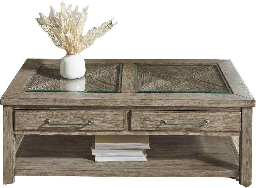 Liberty Skyview Lodge Cobblestone Cocktail Table features French and English dovetail construction, X-reclaimed panels under glass, and bottom shelf for additional storage.Read More