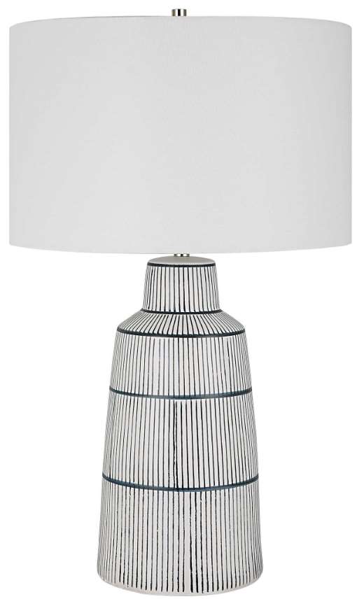 Inspired by the classic nautical stripe knit, this ceramic table lamp sports a satin white glaze with rich navy blue stripes and polished nickel-plated accents. The hardback drum shade is covered in a crisp white linen fabric.Read More