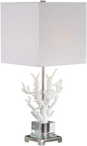 Add nautical style to any space with this realistic white coral lamp that is displayed on an elegant crystal platform, accented with polished nickel plated details. The square hardback shade is a light beige linen fabric with natural slubbing.Read More