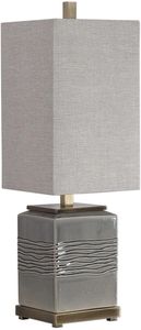 A Contemporary Style Emanates From This Ceramic Base That Features Wavy Embossing That Has A Subtle Organic Feel, Finished In A Warm Gray Glaze, Accented With Plated Antique Brass Details. A Rectangular Hardback Shade In Light Beige Linen With Natural Slubbing Compliments This Piece.Read More
