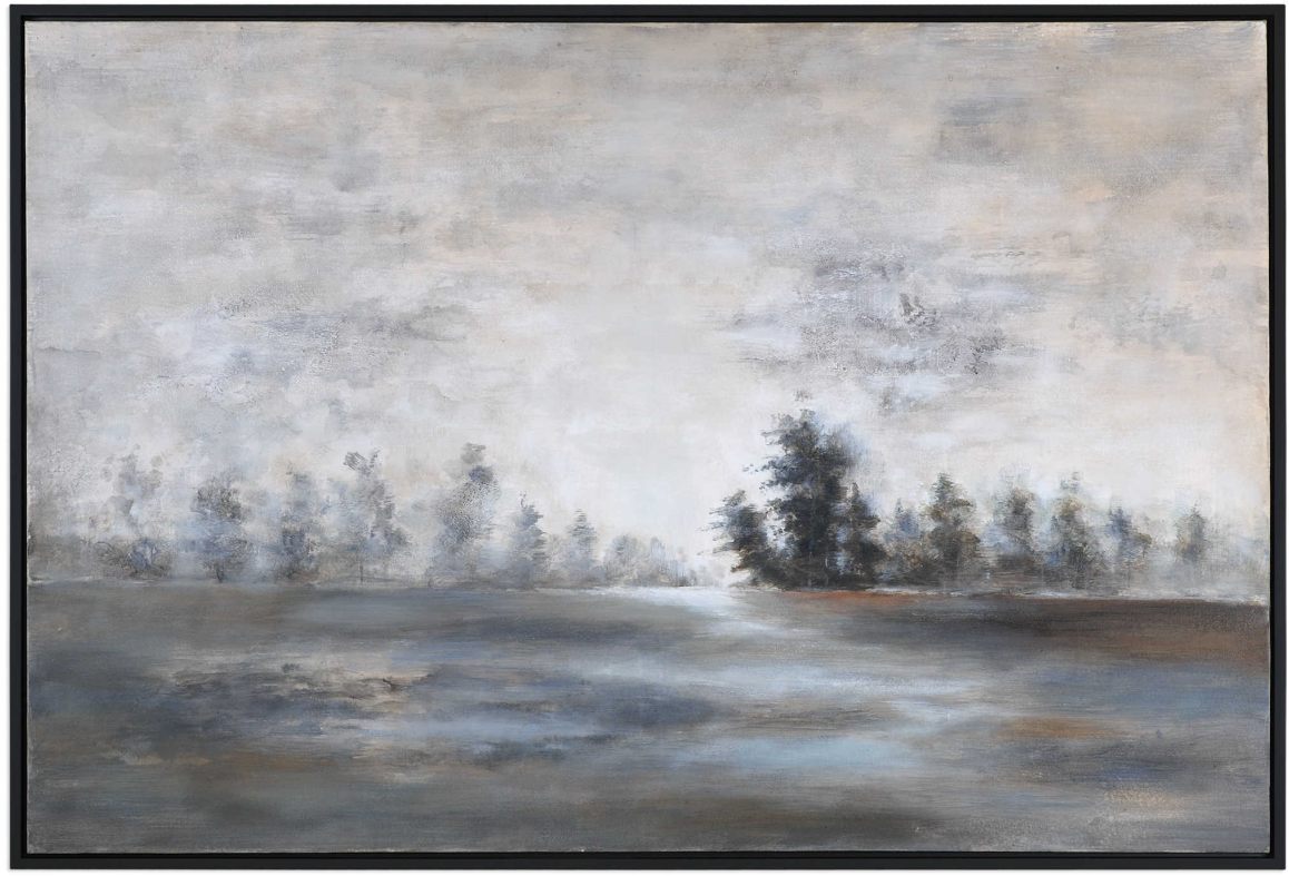 Moody Shades Of Gray, Green, And Charcoal Comprise This Masculine, Hand Painted Landscape. A Peaceful Quality Emanates From This Piece On Canvas, Which Has Been Stretched And Attached To Wooden Stretchers. A Petite, Black Gallery Frame Completes Each Piece.Read More