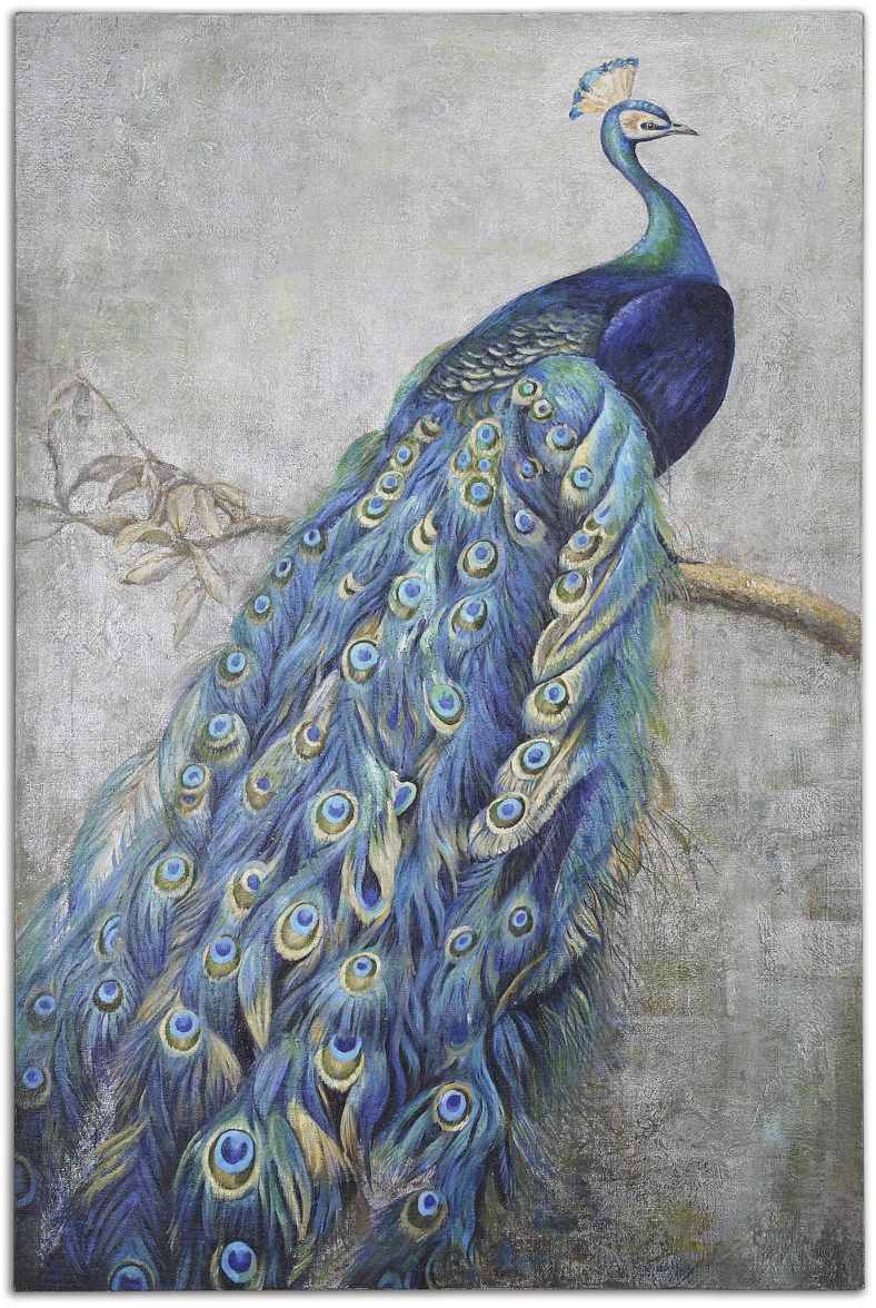 Refined Elegance Meets Eye-catching Vibrancy With This Hand Painted Peacock. Stunning Shades Of Turquoise, Green, And Yellow Are Painted On Burlap Then Applied To Hardboard. This Piece Features Light Texture Detailing.