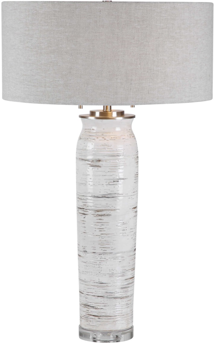 Inspired by the bark of a birch tree, this table lamp features a ceramic base finished in off-white with rust colored accents and noticeable texture and distressing. The piece also has a crystal foot and brushed nickel details. The round hardback shade is a light oatmeal linen fabric with slubbing.