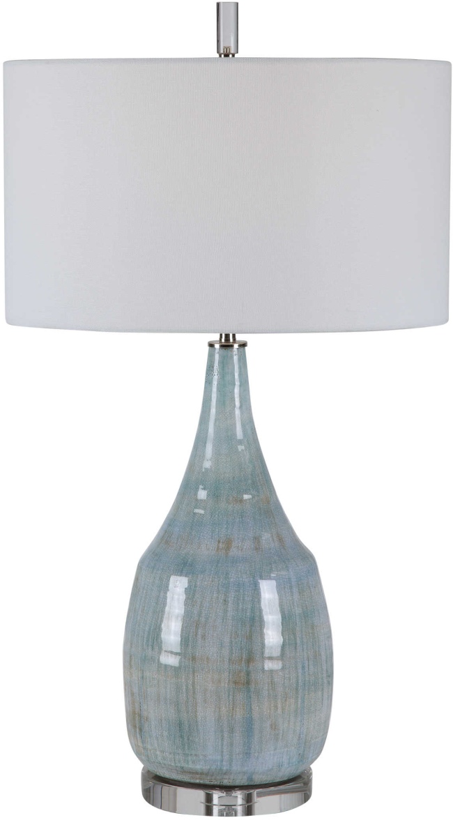 Showcasing a refined coastal style, this table lamp has a ceramic base finished in an aqua and teal crackle glaze with touches of rust brown. Polished nickel and crystal accents highlight the design. The lamp is paired with a round hardback drum shade in a white linen fabric.