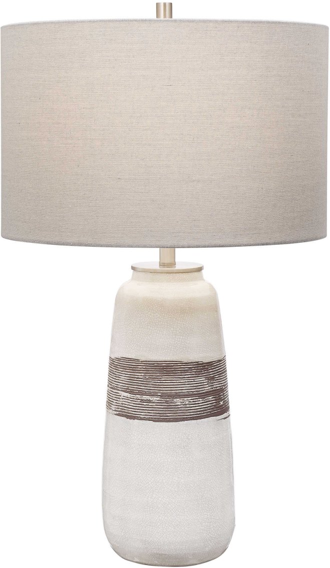 Showcasing a rustic casual look, this ceramic table lamp features an off-white crackle glaze with distressed rust brown details and noticeable ribbed texture. A light gray linen fabric drum shade compliments the piece.Read More