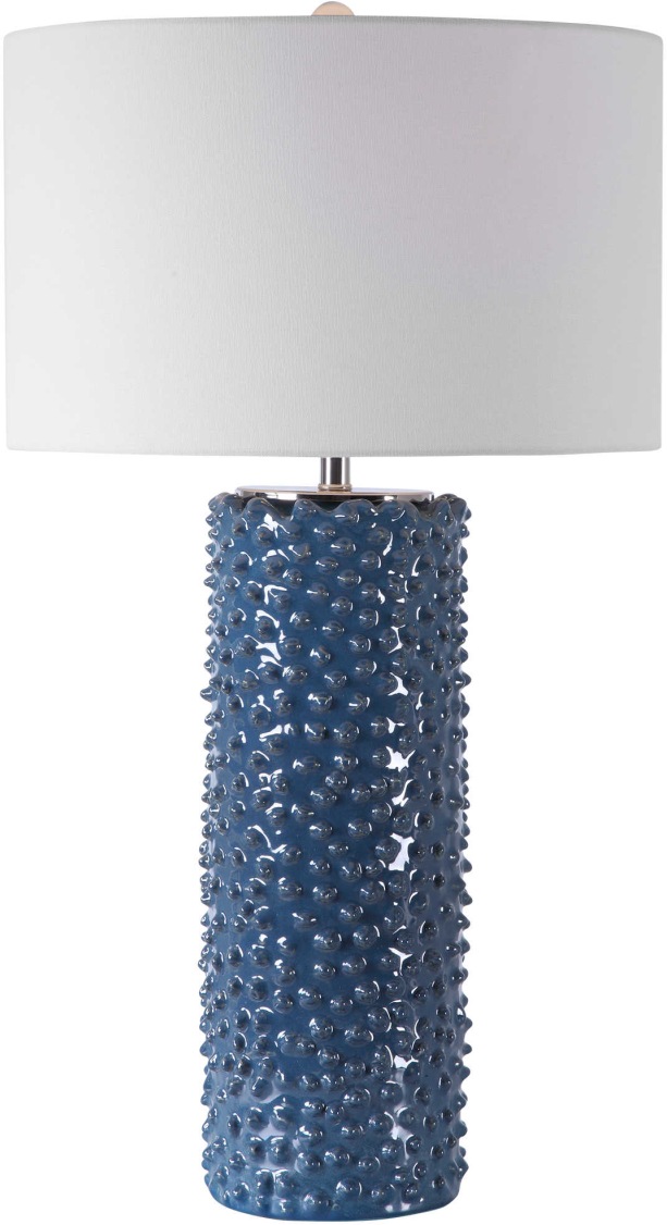 Featuring a casual coastal style, this table lamp showcases textural, visual interest finished in a deep indigo glaze with brushed nickel accents and a crystal finial. The lamp is paired with a white fabric round drum shade.