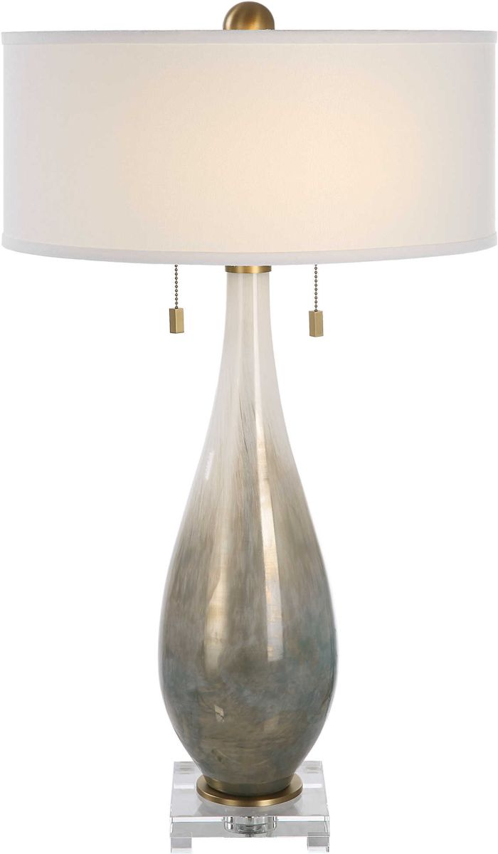 Gloss white glass featuring metallic smoked bronze hues accented with plated brushed brass metal details and a thick crystal foot. The round hardback drum shade is a white linen fabric with natural slubbing.Read More
