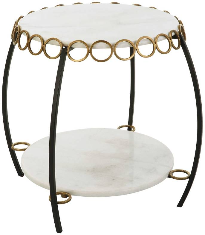 Shelves of honed white marble are decorated with antique gold ringlets with gracefully arched iron legs in matte black. True to the nature of natural materials, each piece will have unique marbling and veining throughout.Read More