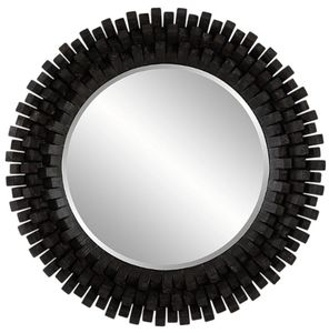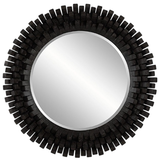 This round wood mirror has a contemporary rustic flair by featuring angled pillars of solid wood stacked in alternating heights for a dramatic and unique display, finished in an ebony stain with a subtle gray wash. Mirror has a generous 1 1/4" bevel.Read More