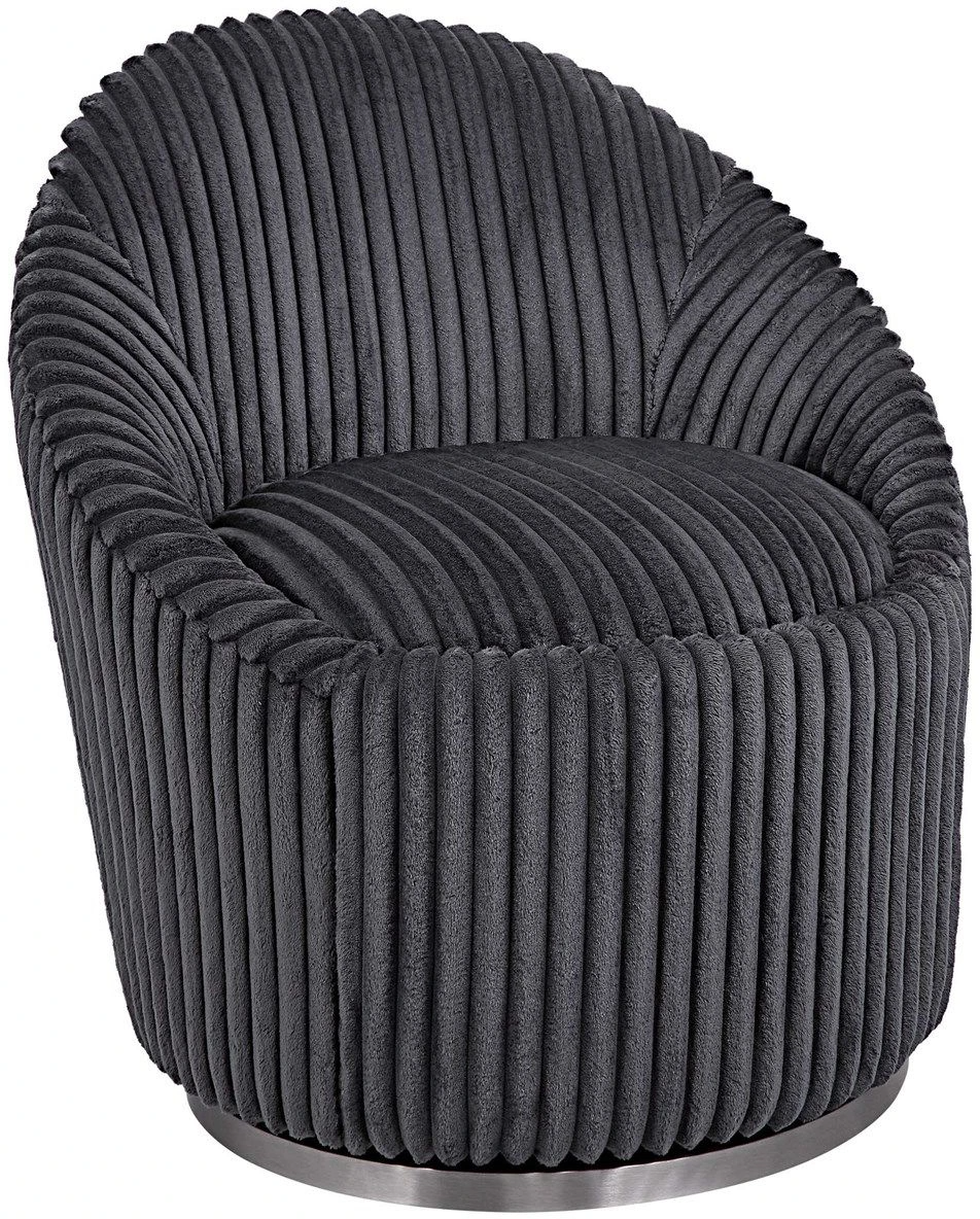 A contemporary accent with a modern edge, this chair is upholstered in a luxurious fluted gunmetal chenille fabric and is accented by a stainless steel swivel base finished in brushed nickel. Seat height is 19".Read More