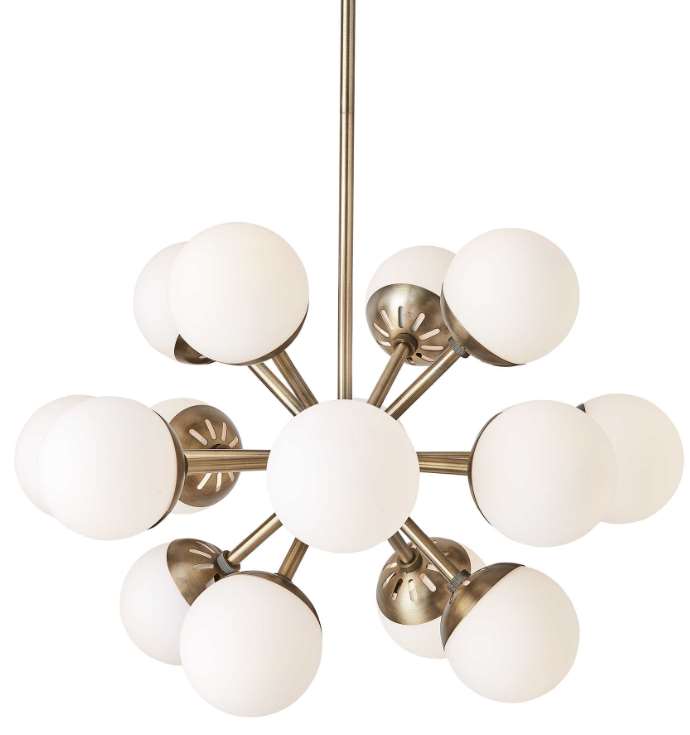 Designed with Mid-Century roots a sputnik center structure finished in a warm antique brass and accented with 5" Matte White Opal globes yields a modern take on vintage style. Supplied with 15' wire, 3-12" stems and 1-6" stem for adjustable installation. With 16-60 watt max candelabra sockets for G16.5 bulbs.Read More