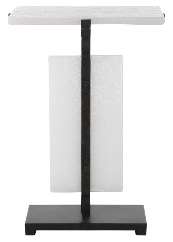 Composed of an aged bronze base supporting two beautiful slabs of bubble glass. Bubble glass is crafted from tiny air bubble trapped within the glass creating a mesmerizing visual effect and allowing some light to pass through.Read More