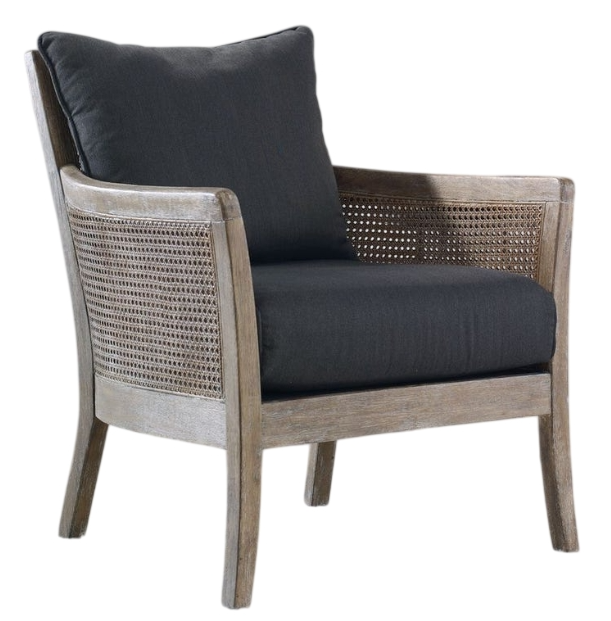 High supportive back and curvy flair arms make a grand style statement in a warm, washed and hand rubbed sandstone exposed hardwood finish with cane sides and tailored in a durable yet lush dark gray fabric.Read More