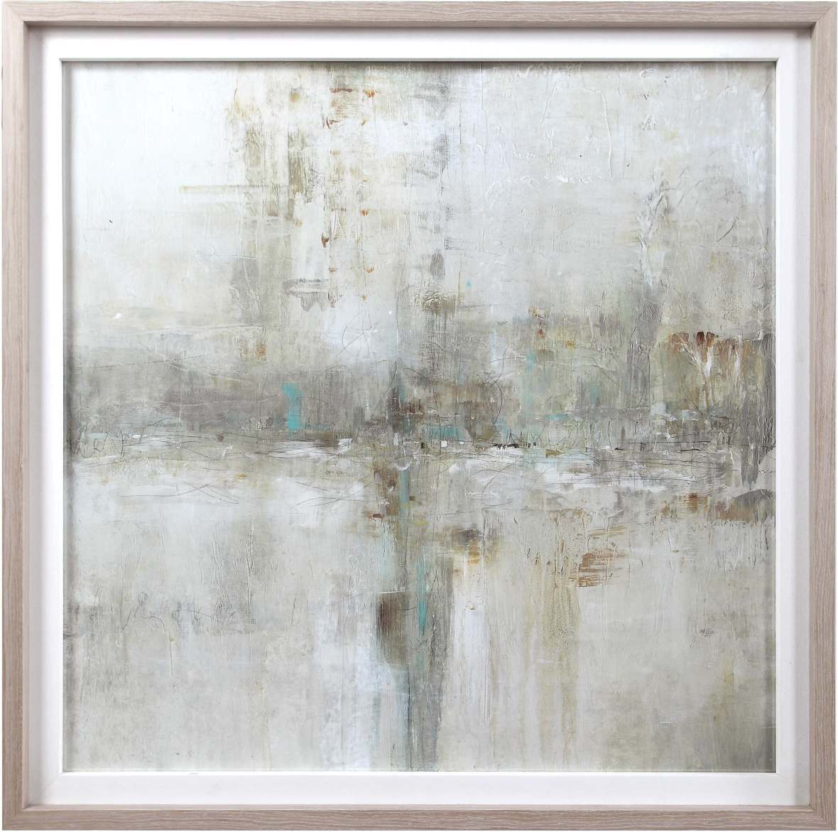 This Modern Abstract Print Features Hand-Embellished Details That Add Dimension And Style. Shades Of Light Gray, Beige, And Tan Are Accented By Pops Of Turquoise And Rust. A Light Wood Frame With A Gray Wash And White Linen Inner Lip Complete This Piece. This Print Is Placed Under Protective Glass.Read More