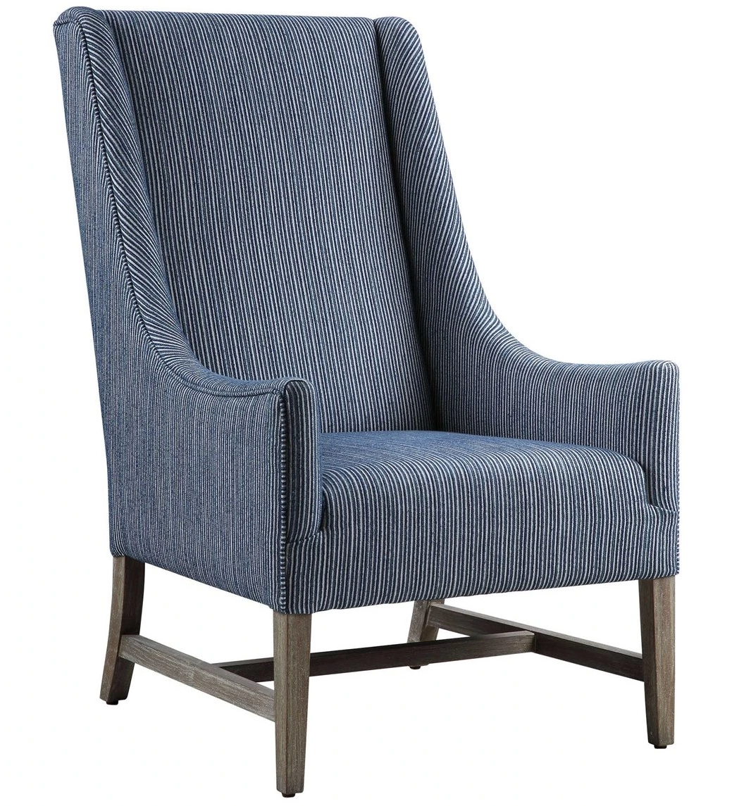 Showcasing a classic wingback style with a coastal feel, this accent chair features a blue and white organically striped fabric, resting on naturally finished solid wood legs. It can create a cozy atmosphere, and act as accent piece that complement the overall décor.Read More