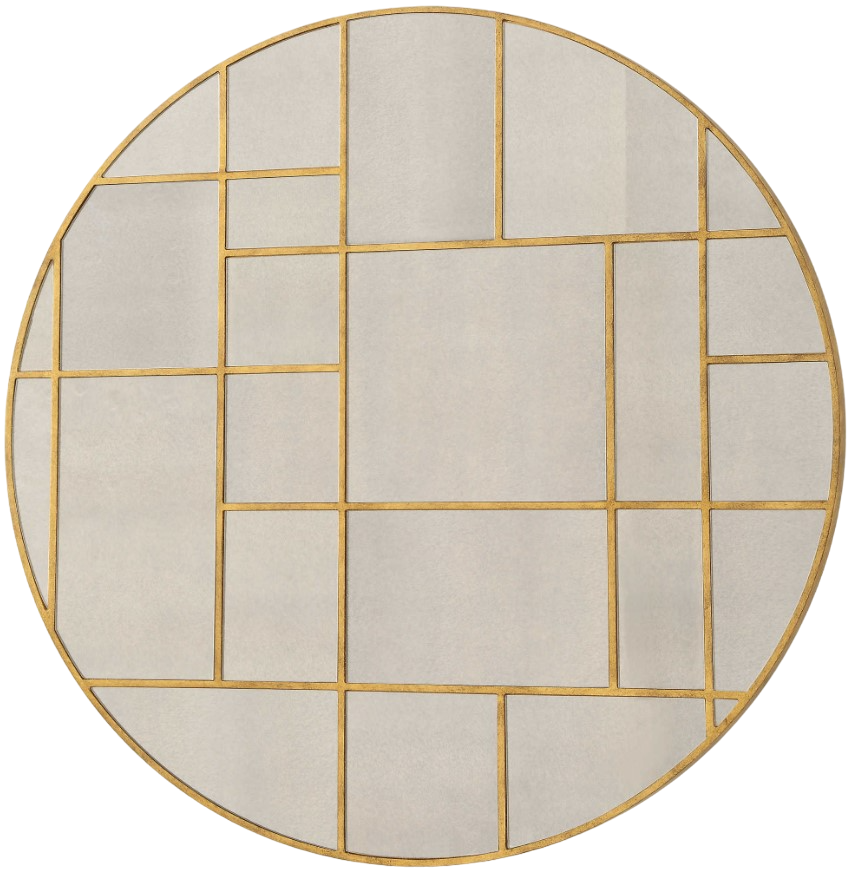 This round mirror by Uttermost is adorned with a geometric grid pattern encasing individual mirror inlays, finished in a lightly antiqued gold leaf that exudes timeless elegance and contemporary flair.Read More