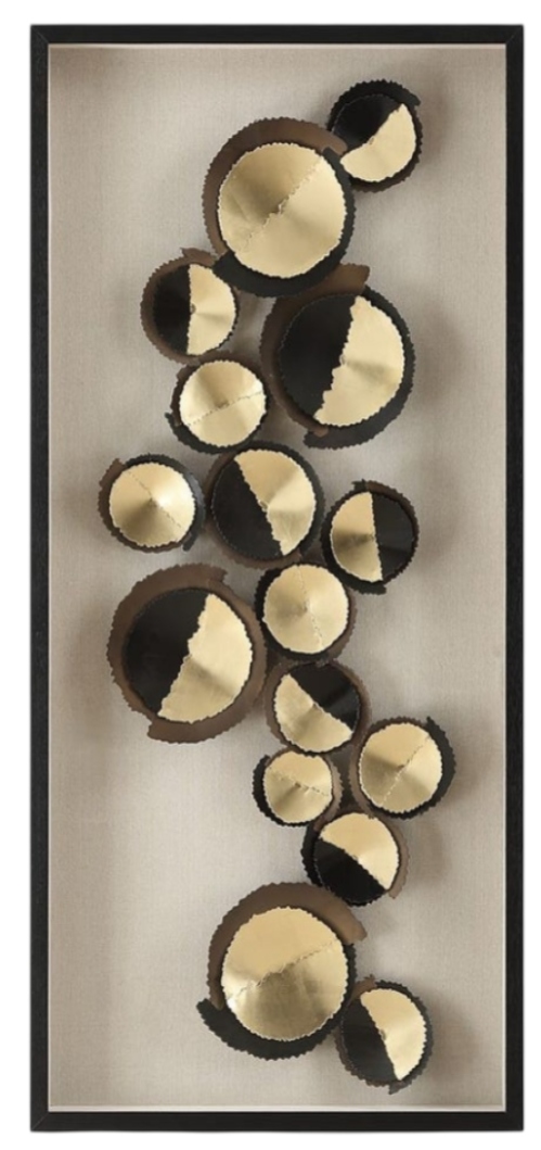 An artful, layered assortment of serrated edge iron discs with gold leaf centers. Displayed over light oatmeal linen in a satin black shadow box frame under glass. Versatile design allows for horizontal or vertical hanging, adding elegance to any space.Read More