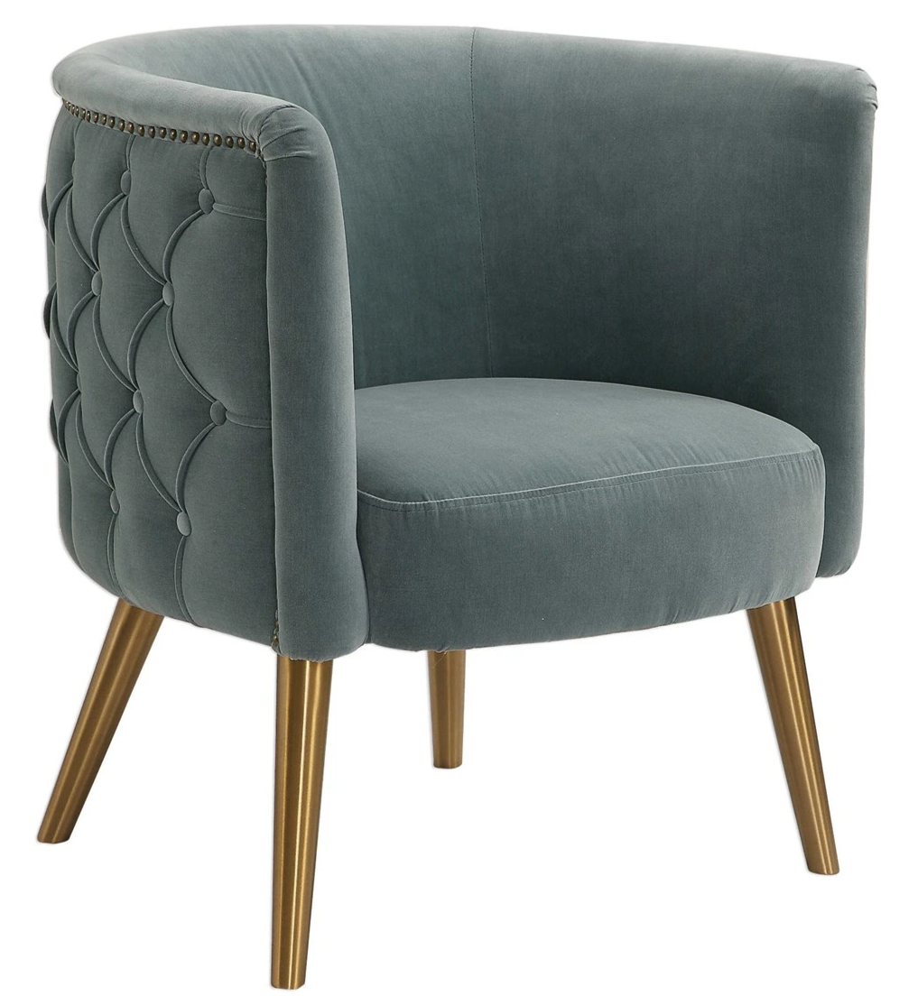 This stylish barrel chair features a plush diamond button tufted surround in a luxurious slate blue velvet lined with antique brass nail head trim, on metal tapered dowel legs finished in brushed brass.Read More