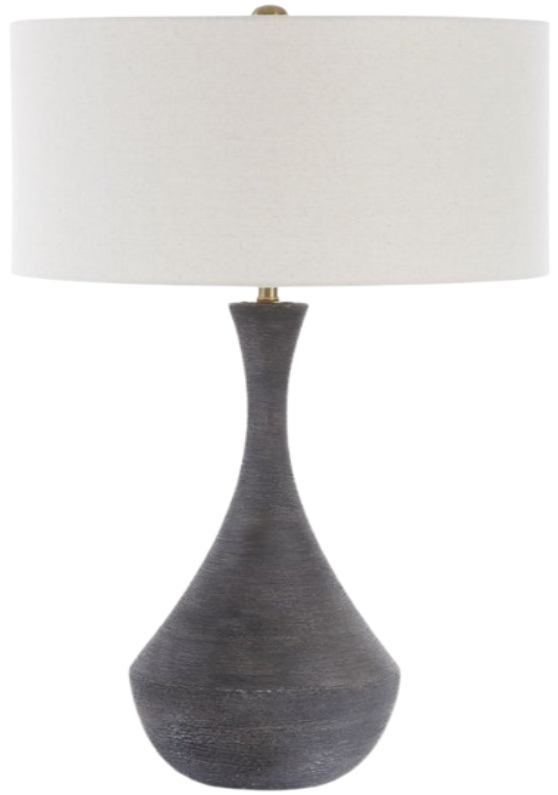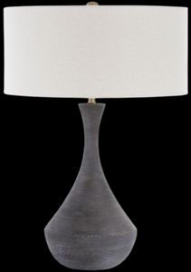 This ceramic table lamp features a heavy horizontal texture finished in a rustic dark charcoal glaze, accented with plated brass details. A round hardback drum shade finished in a casual off-white linen fabric completes the piece.Read More