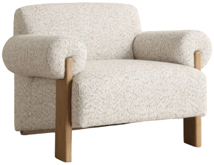 Rolled arms of the Juncture accent chair encapsulate the decorative legs in solid oak with a natural finish. Fully upholstered in a textured boucle with tones of flax, ivory, caramel and taupe. Ideal for a reading nook, living room, or office.Read More
