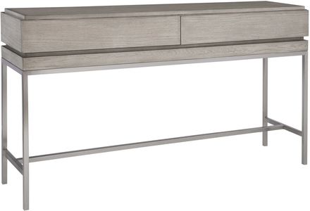 With modern simplicity, this console table is layered in an oak veneer and finished in a light mushroom gray stain featuring two hidden storage drawers. Sits on a stainless steel base finished in brushed nickel.Read More