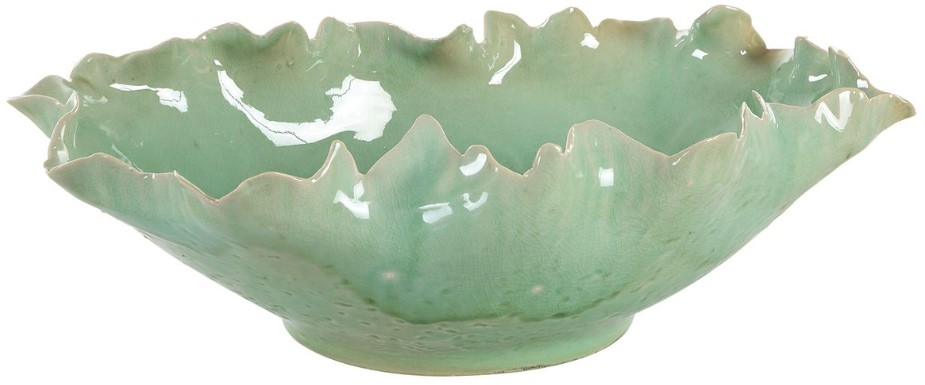 This elegant ceramic bowl features a stunning ruffled edge design, evoking the delicate shape of a blooming flower. Its soft green glaze with a subtle crackle finish adds texture and sophistication, making it an ideal statement piece for any modern or classic decor. Perfect for displaying as a centerpiece or for functional use.Read More