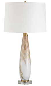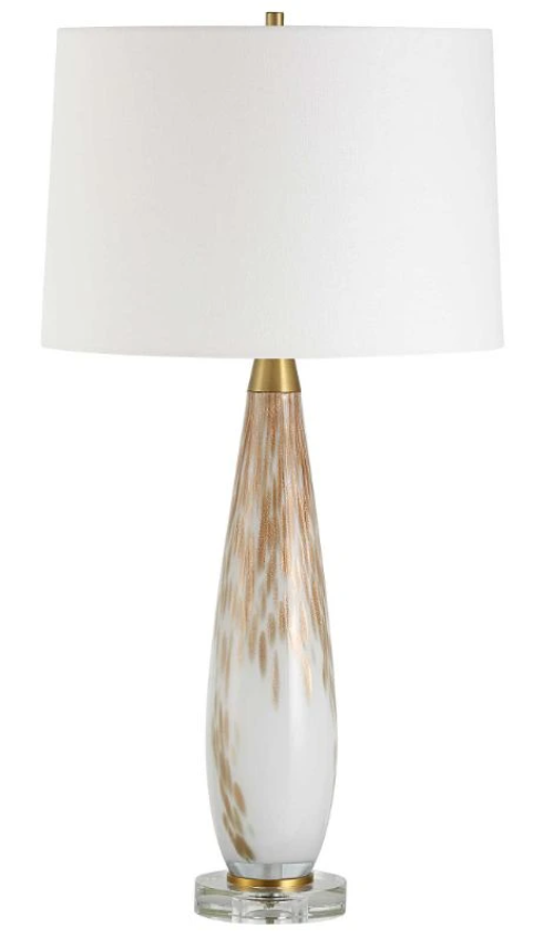 This sleek and slender glass base features a brilliant white background with spotted metallic gold detailing displayed on a thick crystal foot and paired with plated brushed brass accents. The slightly tapered round hardback shade is covered in a crispy white linen fabric.Read More