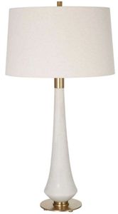 This table lamp adds an air of elegance and sophistication to any space. The body of the lamp is crafted from ivory man-made stone that accurately replicates the look of Thassos marble and is accented by iron details finished in brushed brass.Read More