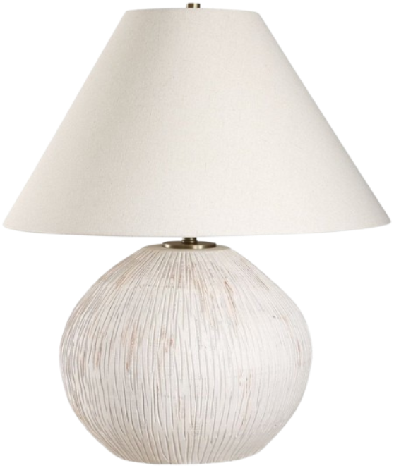 The Meryl Table Lamp showcases a hand crafted porcelain base finished in an aged white with rust distressing over organic textural lines that are accented with plated antique brass detail. The coolie style large round shade is made in an off-white linen fabric.Read More