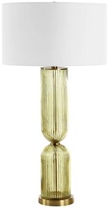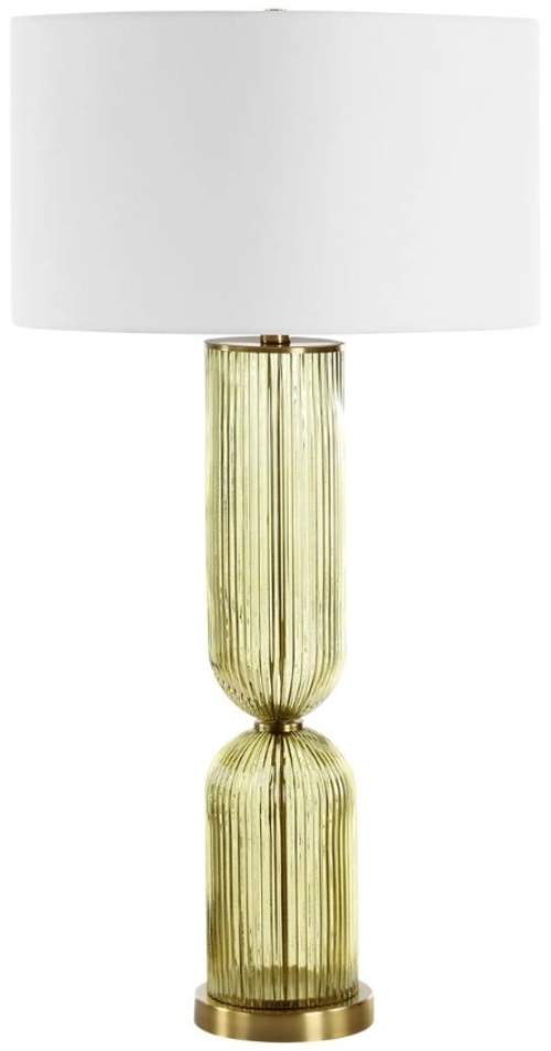 This tall, elegant lamp truly makes a statement! The transparent Olive glass is adorned with slim vertical fluting that catches the light on every curve, paired with brass-plated details. A round hardback drum shade made with a crisp white linen fabric completes the piece.Read More