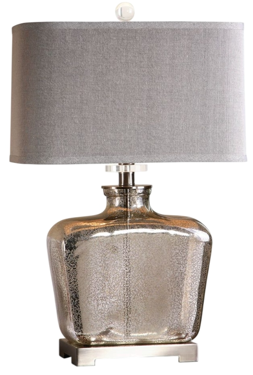 Speckled mercury glass with brushed nickel plated details and crystal accents. The aesthetic slightly tapered rectangle hardback shade is a light beige linen fabric with natural slubbing and rounded corners.Read More