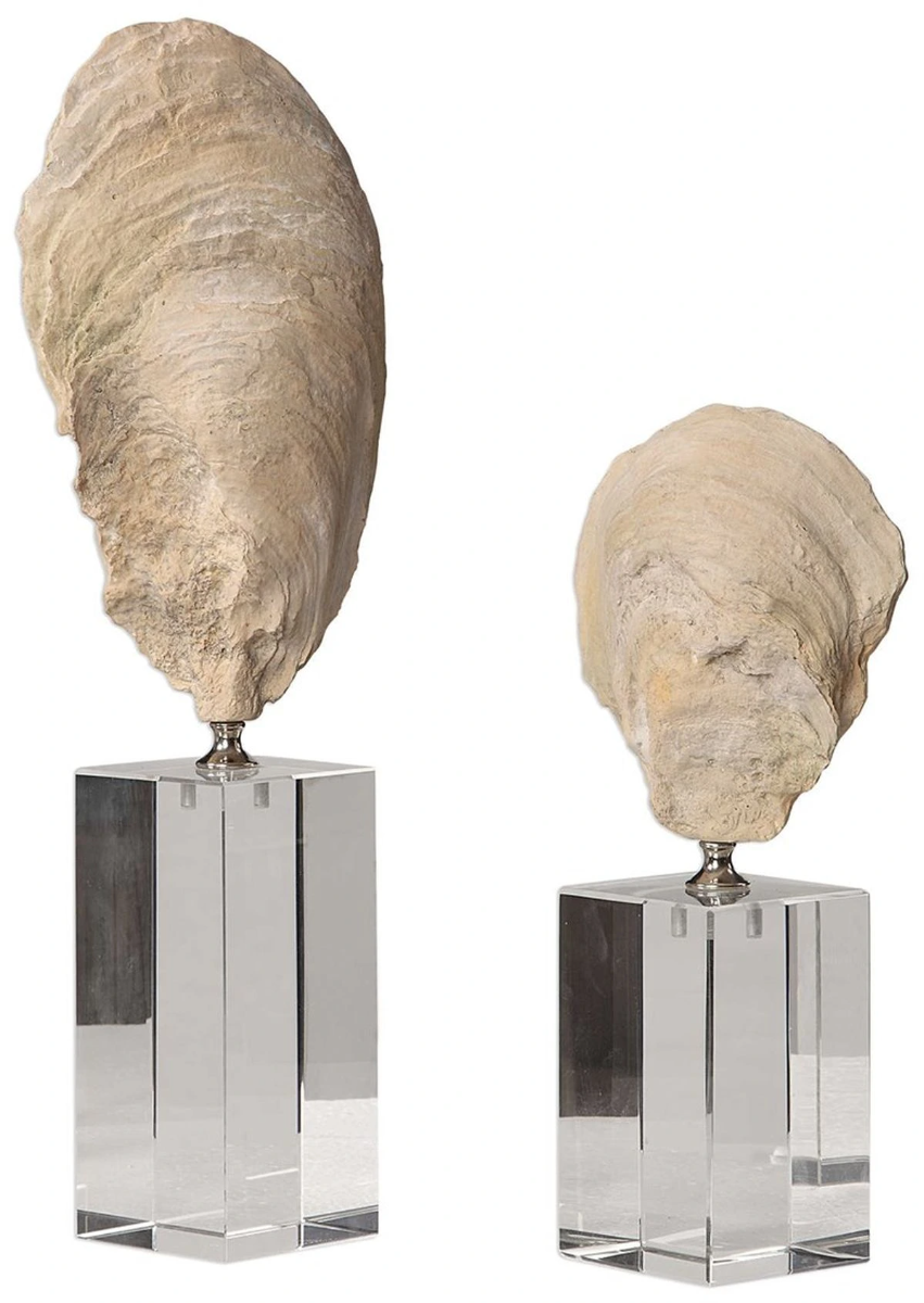 Cast from natural oyster shells these sculptures feature an aged ivory finish with chrome accents and set atop staggered height crystal cube bases. Sizes: Sm-5x11x3, Lg-5x15x3