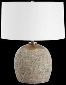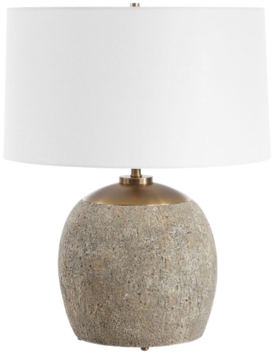 The Raylan Table Lamp is crafted from a heavily textured concrete that's finished in a rubbed brown, accented with antique brass plated details, bringing a touch of refined rustic charm to any space. The slightly tapered round hardback shade is a casual white linen fabric.Read More