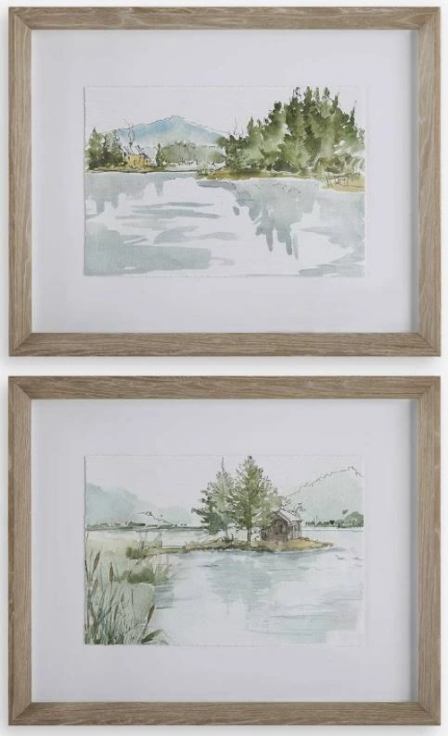 Inspired by serene lake views, these watercolor-style sketches display tranquil shades of smokey blues, olive greens, and mustard yellows. Each landscape is accented by a white background and an gray washed pine frame under glass. Artwork by Anne Tavoletti.Read More
