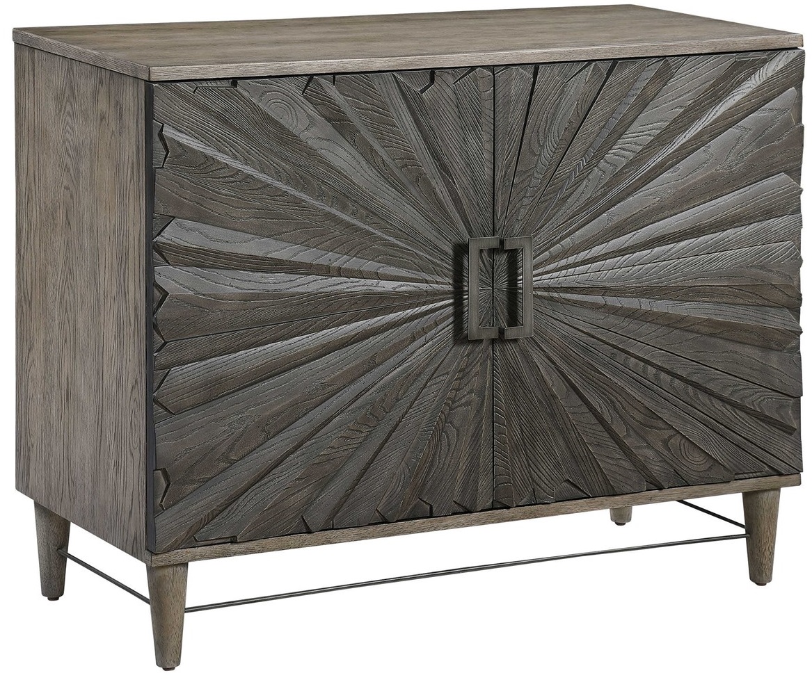 Inspired by global bohemian style, this two door cabinet features a striking 3-dimensional starburst design, finished in a dark ebony oak veneer. The contrasting solid wood case is finished in a gray oak stain, accented by steel hardware and accent stretcher finished in aged gunmetal.Read More