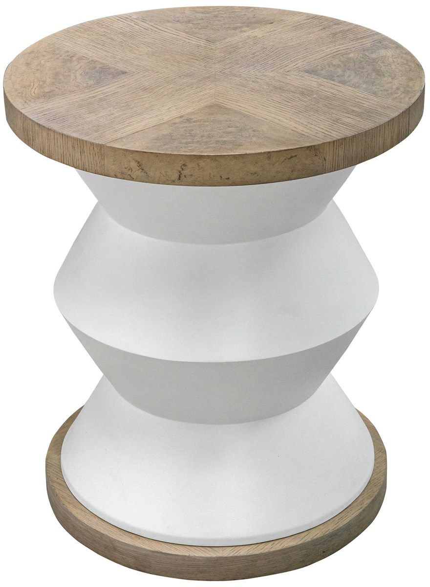This modern side table showcases a geometric base finished in matte white. The top features a light honey toned stain over an oak veneer marquetry pattern, with burl accents.Read More