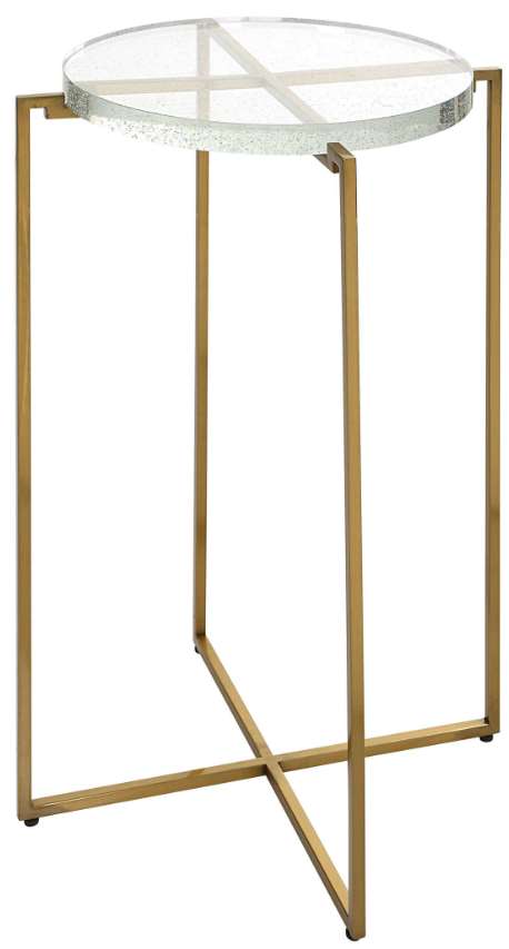 Sleek and sophisticated, this accent table showcases a petite stainless steel frame finished in brushed gold and is accented by a thick-seeded glass top. Make a bold statement by incorporating this stunning furniture into your home.Read More