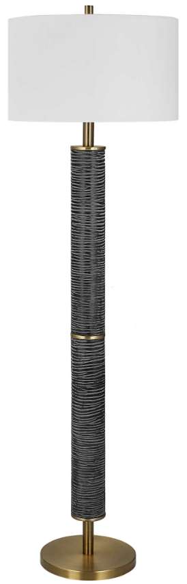 This floor lamp features an organically carved design in a rustic gray-black with solid iron details finished in plated antique brass. The lamp is paired with a hardback drum shade in a white linen fabric.Read More