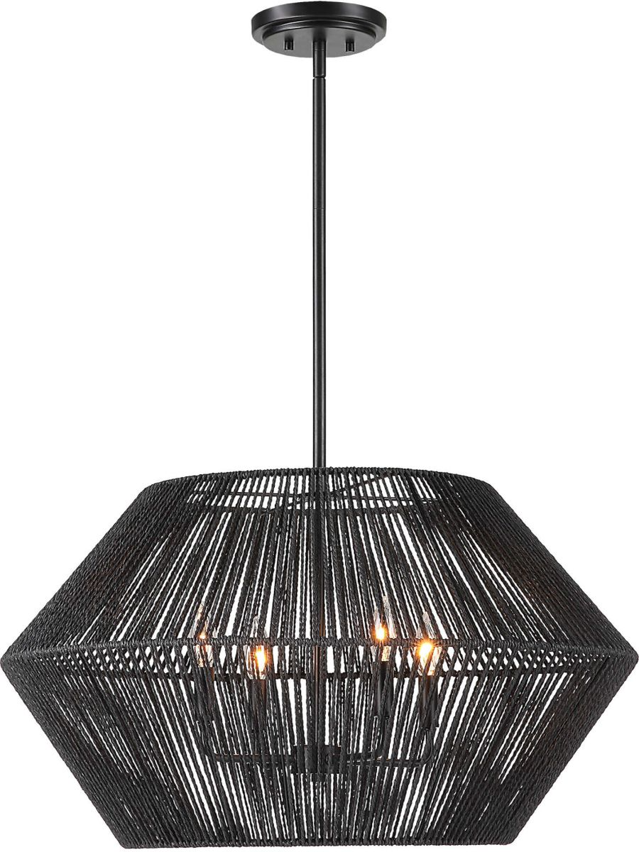 Natural rope is hand wrapped and dyed a chic black to form the shade of our 4 light pendant giving both an adventurous & dressed up feel in matte black. 4-60 watt max candelabra sockets.Read More