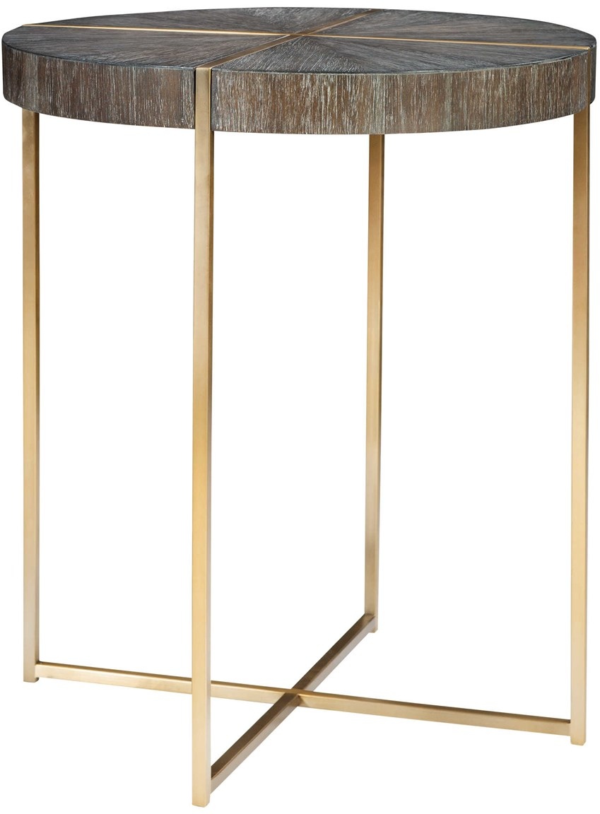 Contemporary in style, this accent table features a stainless steel framework finished in a brushed brass with a round acacia veneer top in a dark walnut stain washed with a light gray glaze.Read More
