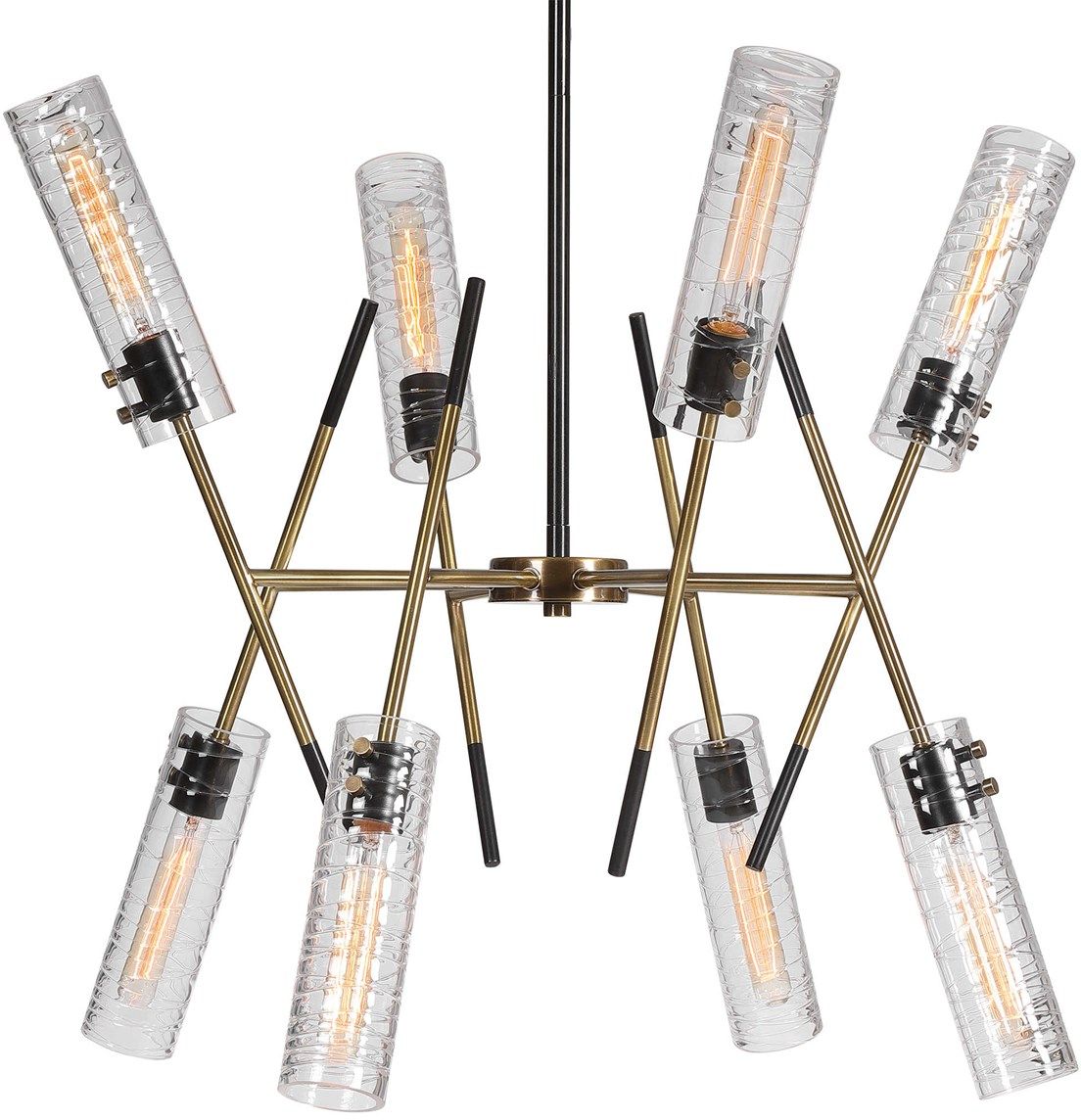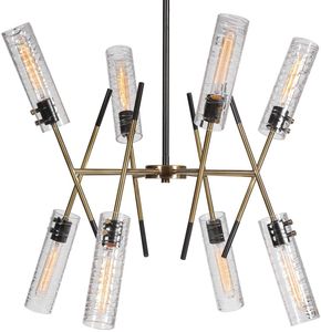 A dramatic soft contemporary look blends straight lines and linear glass to give us this eye-catching 8 Lt. pendant. Featuring a combination finish of texture black and antique brass complementing the narrow clear cylinders of glass with unique swirled thread accents. With 8-60 watt max, Edison sockets and includes 8-40 watt clear T30 bulbs. Supplied with 15' wire, 3-12" stems and 1-6" stem for adjustable installation.Read More