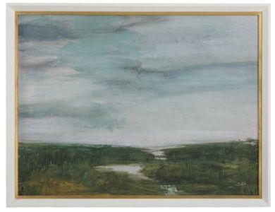 Discover the serene beauty of the lowcountry with The Path Of The Water framed print. An idyllic blue sky meets the marsh showcasing the understated elegance of the South's iconic scenery. Surrounded by a white frame with wood grain detailing and gold leaf rabbet. Artwork by Julia Purinton.Read More