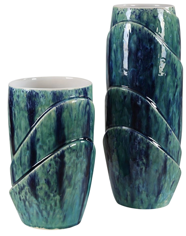 Introducing our stunning set of two ceramic vases, a harmonious blend of nature's hues. Crafted with care and adorned in a captivating blue and green reactive glaze, each vase boasts a unique, organic pattern. The interior is finished in a pristine white glaze, providing the perfect contrast to showcase your blooms.Read More