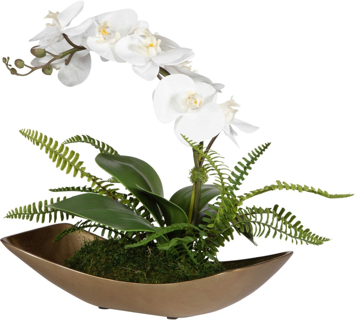 A graceful, flowing white orchid seems to float over a bed of naturally preserved moss in a textured cast aluminum antique brass boat. Combines premium quality materials with unique, high-style designRead More