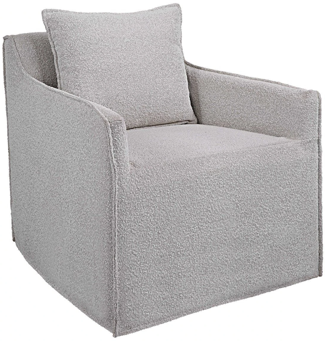 Casual swivel accent chair features a tailored slipcover made from ivory and warm gray boucle fabric with flanged edges and a matching square pillow. The hardwood swivel base is finished in a natural ceruse. Seat height is 18".Read More