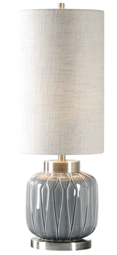 Aged gray ceramic, featuring an embossed decorative design, accented with heavily antiqued brass plated details. The tall, round hardback shade is a light khaki linen fabric with heavy slubbing. Due to the nature of fired glazes on ceramic lamps, finishes will vary slightly.Read More